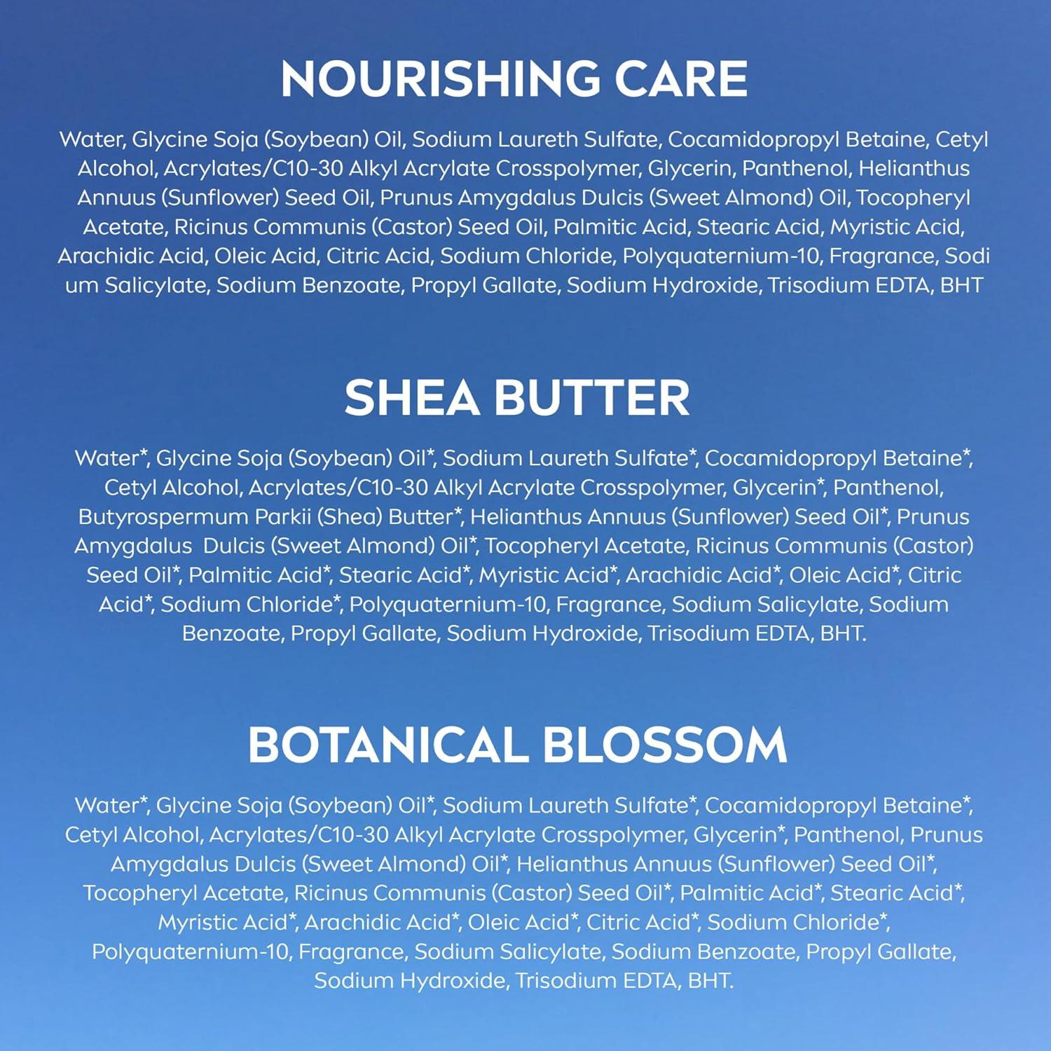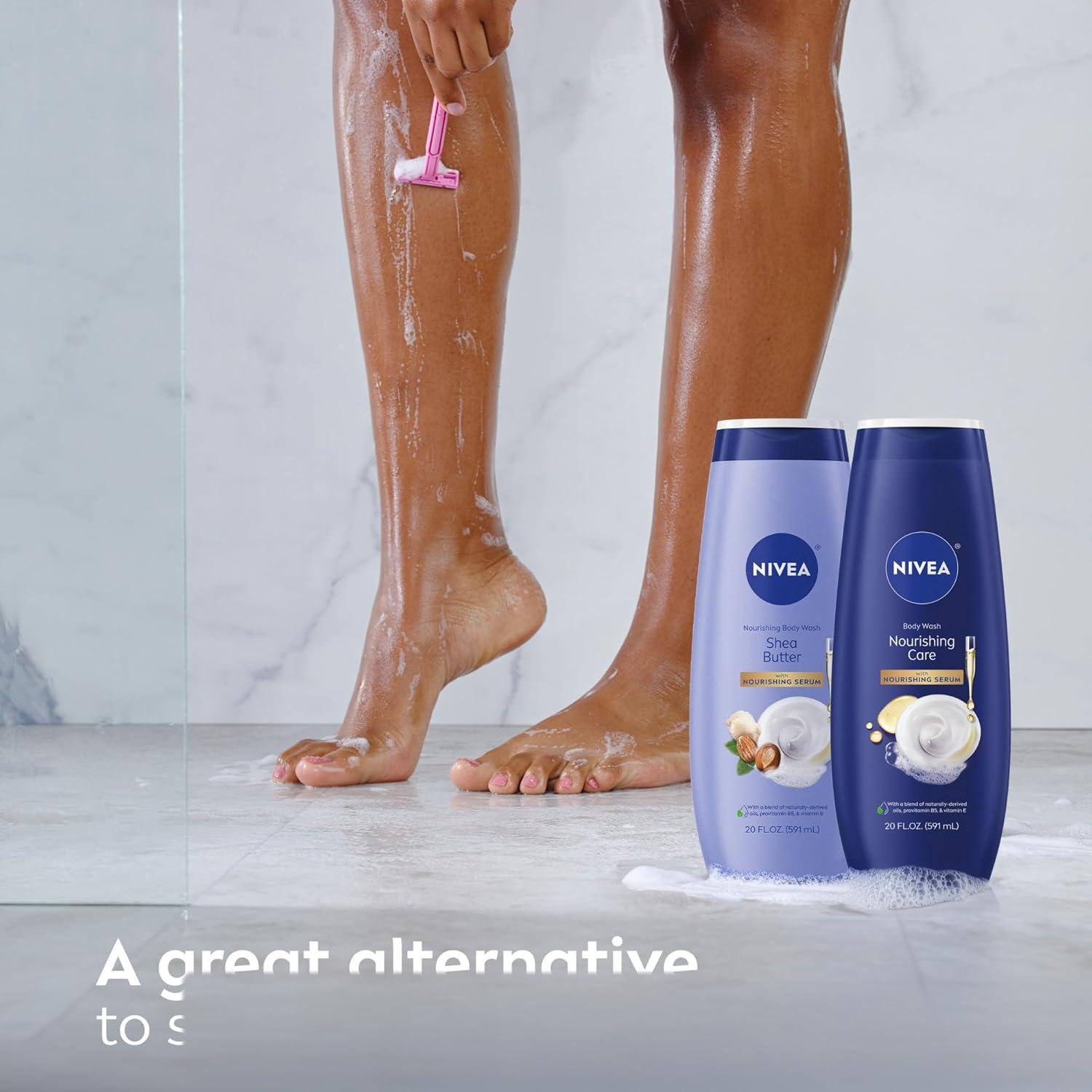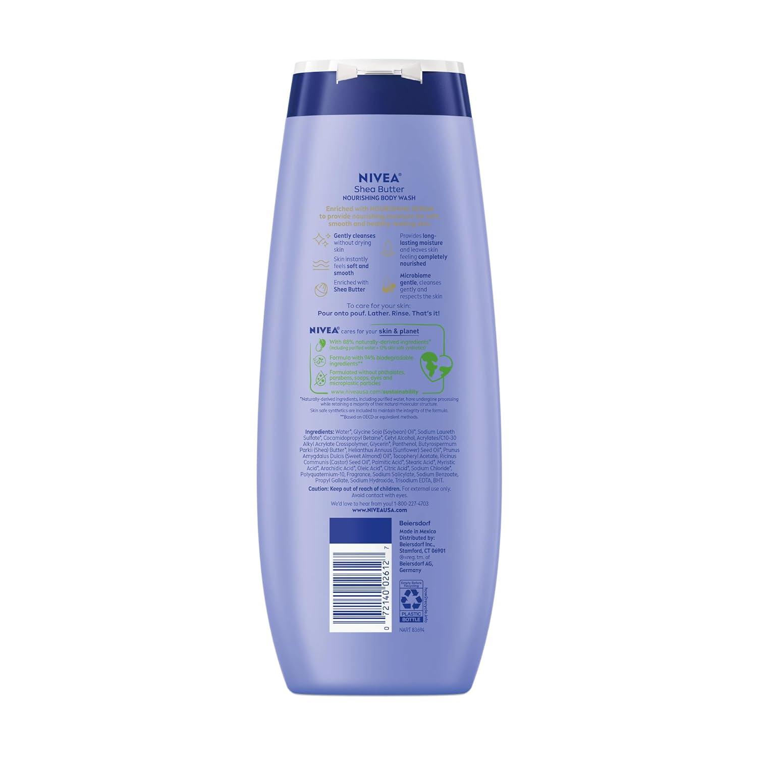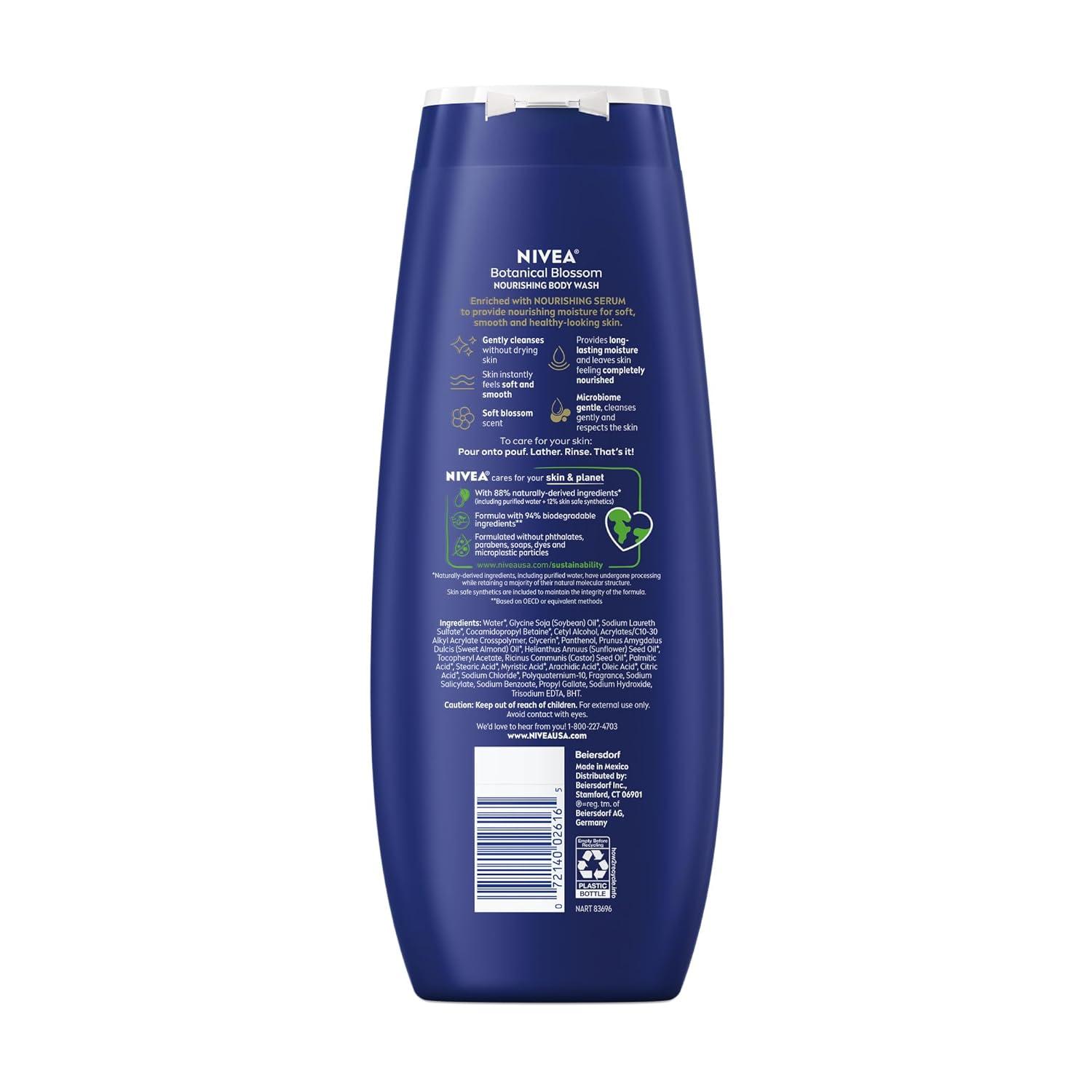 This NIVEA Body Wash Set includes one 20-fluid ounce bottle each of NIVEA Nourishing Botanical Blossom Body Wash, NIVEA Nourishing Care Body Wash and NIVEA Nourishing Shea Butter Body Wash. Each women's body wash provides nourishing moisture for soft, smooth and healthy-looking skin. These hydrating body washes are enriched with a unique blend of naturally-derived* oils, Provitamin B5 and Vitamin E. NIVEA Nourishing Shea Butter Body Wash is enriched with Shea Butter for an especially moisturizing body wash. This NIVEA body wash set gently cleanses and gives you a fresh and hydrated skin feeling. It delivers long-lasting moisture that leaves skin feeling soft and smooth all day with a creamy lather that makes a great shaving cream alternative. Each microbiome gentle body wash is free from parabens, phthalates and microplastic particles. NIVEA Nourishing body washes use 88% naturally derived ingredients* have a 94% biodegradable formula**, and are packaged in a bottle made from 50% recycled plastic***, reflecting NIVEA's commitment to sustainability. *Naturally derived ingredients, including purified water, have undergone processing while retaining a majority of their natural molecular structure. 12% skin safe synthetics are included to maintain the integrity of the formula. **as per OECD or equivalent methods ***excluding label