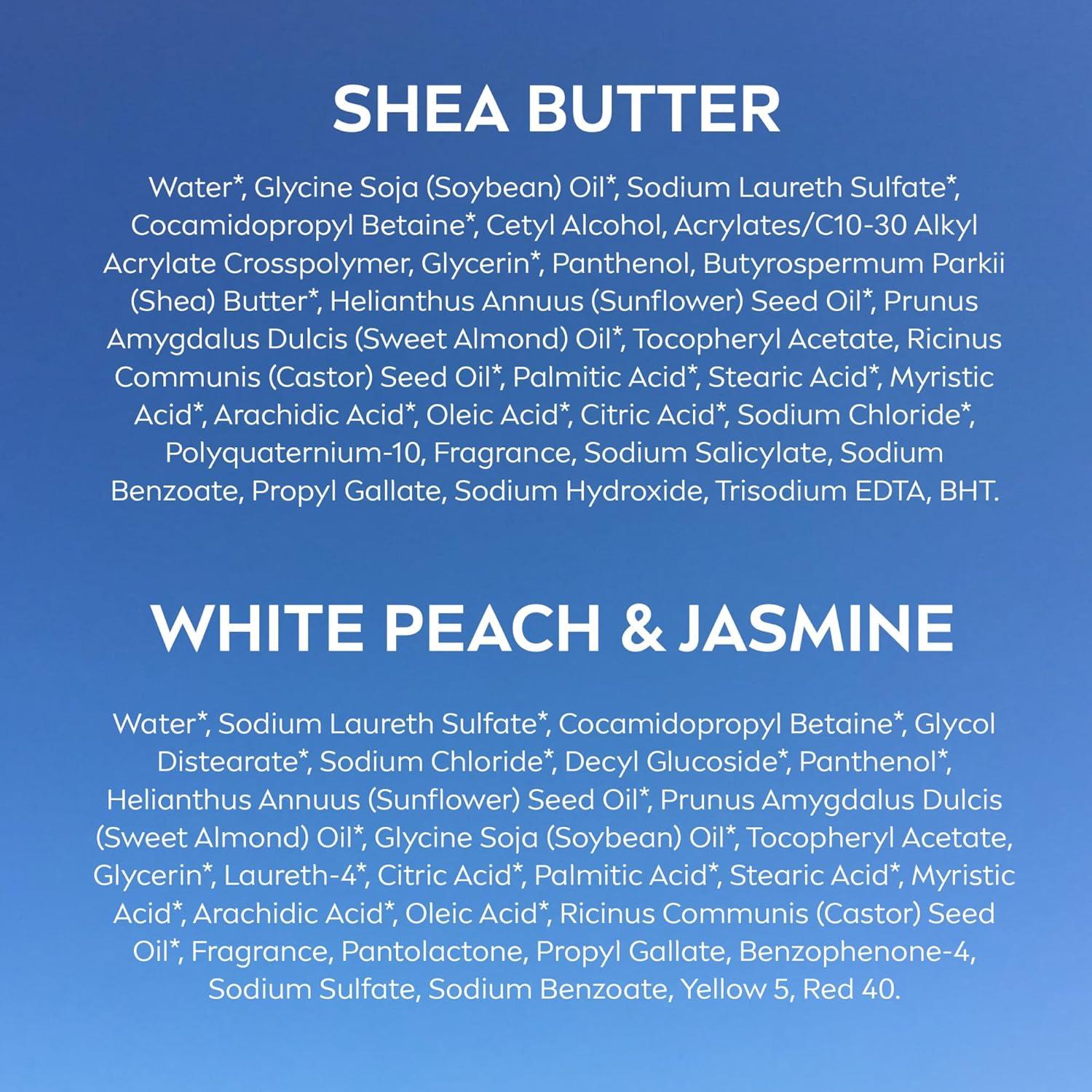 BODY WASH PACK INCLUDES: One (1) 20 fluid ounce bottle of NIVEA Nourishing Shea Butter Body Wash and one (1) 20 fluid ounce bottle of NIVEA Refreshing White Peach and Jasmine Body Wash
